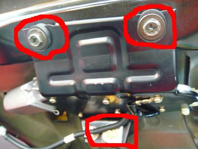赤丸の3つのナットとウォッシャー液のチューブと電源のカプラーを外します。