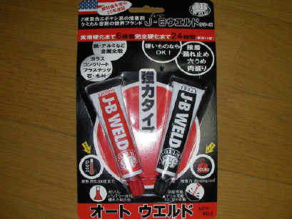 作業③ ②の後の割れた箇所に①のエポキシ系接着剤を付け、さらにプラスティック補強用テープで固定。 <補強 その2>どうやら、補強が甘かったようです。みんカラのお友達に助言をいただき再補強です! まず世界最強の接着剤、「オートウエルド」を手に入れます。 ![]()