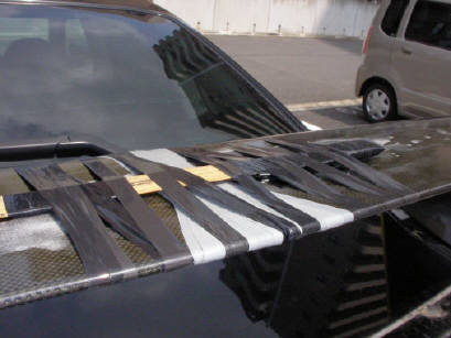 <穴あけ~仮止め>※まだまだ先は長いんですが、やる気を出すために、仮止めしてみます。定規などで固定してビニールテープでぐるぐる巻きにして穴を開ける位置に印をつけて、 ドリルでまずは2mmの穴を開けて、その穴をドリルで6.5mmに広げます。 ちょうど、トランクの左右の薄いところに左右で4箇所、穴をあける事になるはずです。 穴の真下は「水はけ」の場所なので、水漏れの心配はありません。 ※ウィングがそってたりすると正確な位置が測れないので、何か支えなどをしてウィングを水平にします。 ![]()